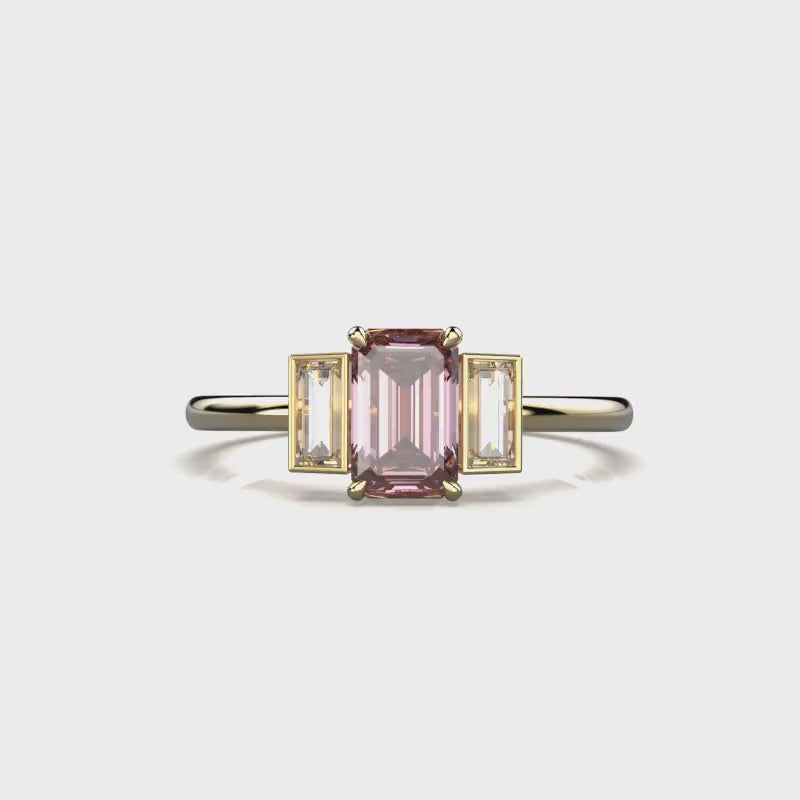 La Bague Christine marie la rigueur du style Art Déco à la douceur absolue. Elle présente un sublime diamant rose taille Émeraude de 1 carat, une pierre rare et tendre, mise en valeur par deux diamants baguette latéraux.